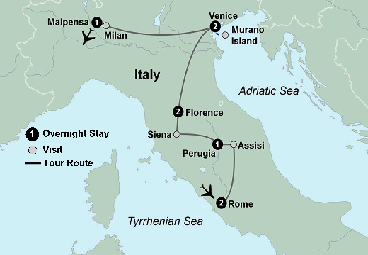 Highlights: Rome, Tuscany, Assisi, Perugia, Siena, Florence, Chianti Winery, Venice, Murano Island, Milan