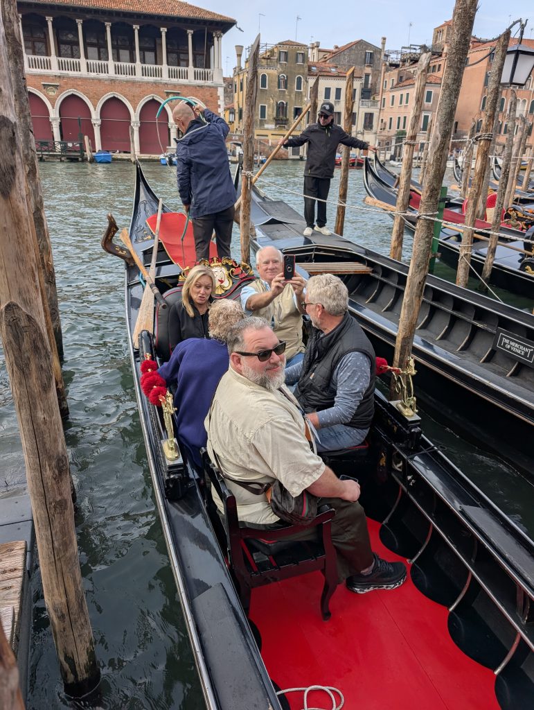 Then it was time for the real deal: our gondola ride. Sliding into the boat, the city unfolded around us like a storybook. Chuck couldn’t stop grinning—honestly, I think he was considering quitting life back home just to become a professional gondolier. We floated past marbled palaces, tiny bridges, and curious locals peeking out of their windows, all the while trying not to look like complete tourists (spoiler: we failed gloriously).