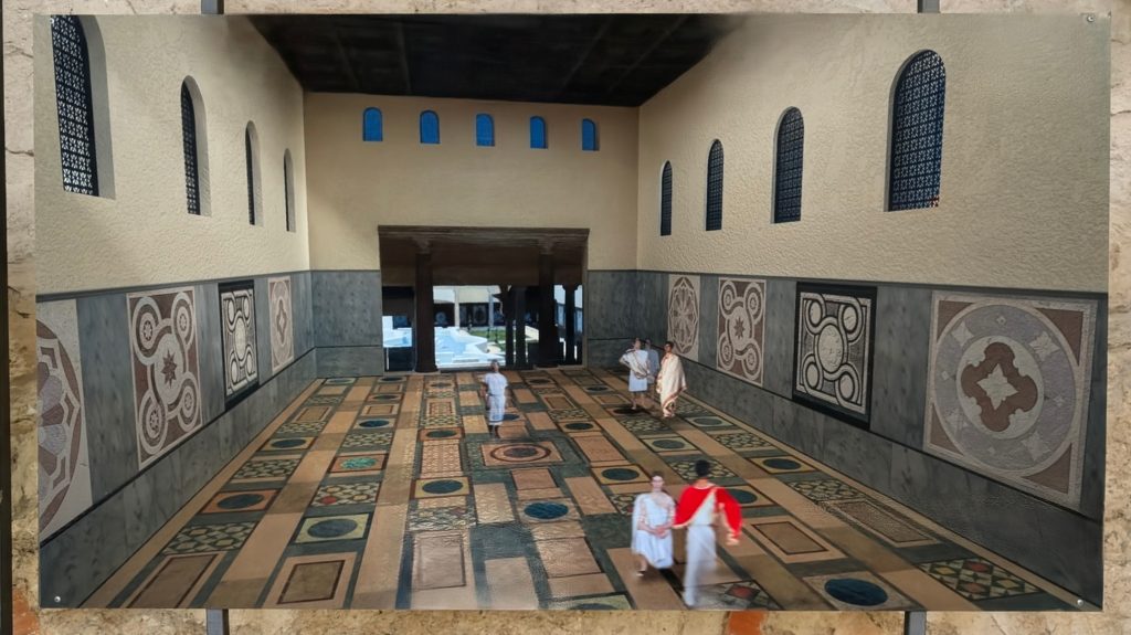 From rooms dedicated to hunting and sports to feasting halls and large mosaic baths, every detail reflects Rome’s grandeur. Modern plumbing, servant quarters, chariot race mosaics, and intricately carved columns make the villa a living museum. I paused to admire a stone-carved square window, imagining life amid purple potted flowers and horse statues guarding the courtyard.