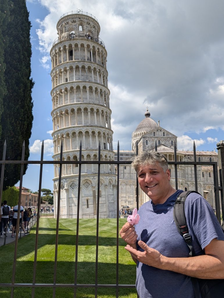 This morning began with a golden Sunrise Over the Piazza dei Miracoli, the warm Tuscan light casting long shadows across one of Italy’s most iconic squares. The air was crisp, the sky cloudless—perfect for wandering among centuries-old wonders. I set off, camera in hand (and pink bunny in tow—Rosie’s travel gift to me, always perched proudly on my shoulder or peeking from my backpack).